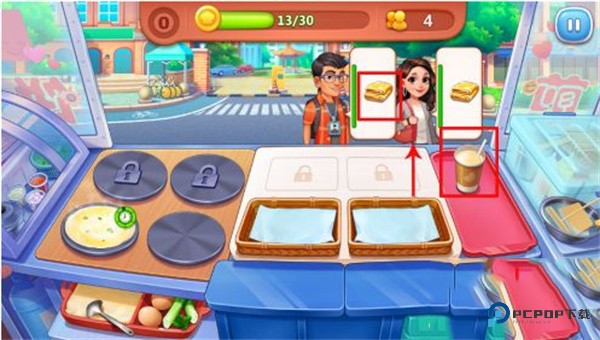 2、根据顾客头顶出现的需求图标,点击提供对应商品 ——【煎饼】或【豆浆】。