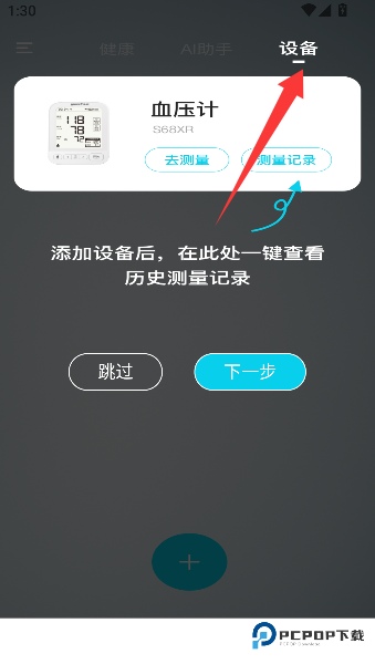 3、选择"设备"功能启动血压测量,智能设备悄然开始工作,数值跳动间仿佛能听见血管里小鱼游动的细微声响。