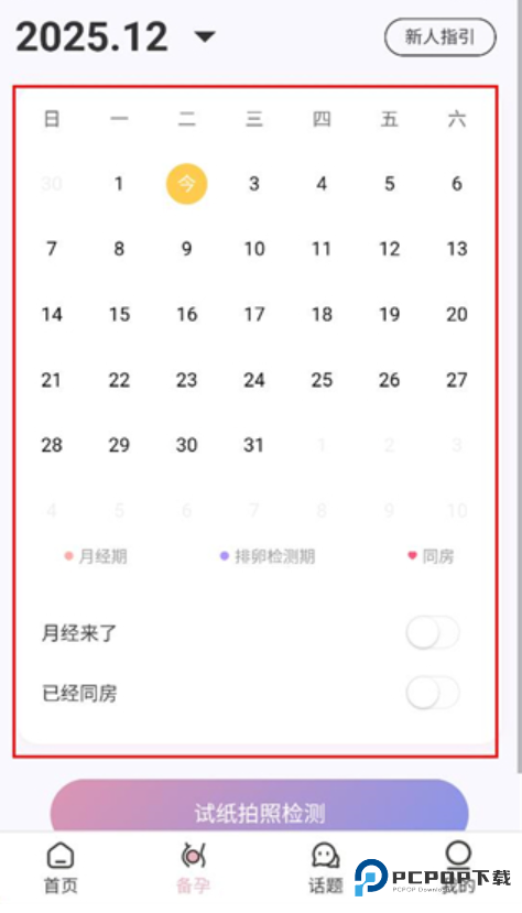 3、界面将自动进入备孕功能主页,在此可看到核心的生理日历视图及各主要功能入口,至此完成初始设置。