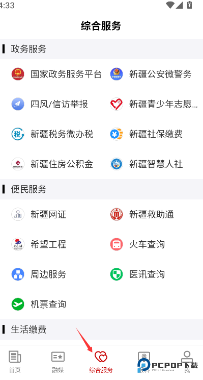 1、在应用主界面中找到并点击“综合服务”选项,页面将跳转至包含多种便民服务的综合分类页面。