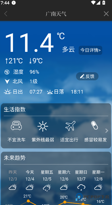 3、页面将展示包含温度、湿度、风向风力、空气质量指数等多维度的气象数据详情。
