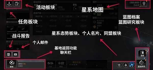 地图板块 (图标常为小地图):一个便捷的小型星图窗口,直接固定在主界面上。点击小地图通常能展开或切换到完整的星系图。它能让你快速查看自身位置、周围空间基地分布、资源点位置、以及邻近的其他玩家或 NPC 势力范围,方便规划下一步行动方向。