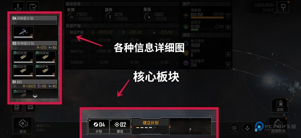 计划板块 (图标常类似时钟或清单):点击后打开一个面板,显示你当前正在执行的所有任务或计划的进度详情,比如舰队到达目的地剩余时间、采矿进度等。