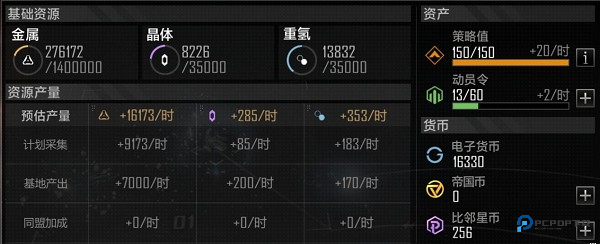 这里清晰显示你的 金属、晶体、重氢 当前储备量、每分钟产出速度和仓库容量上限。