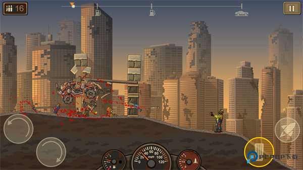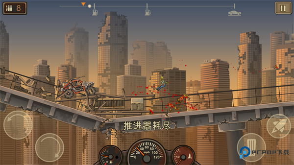 末日跑酷就该横冲直撞!游戏核心特别明确:飙战车碾僵尸闯关卡,撞飞障碍物的血肉横飞画面就是爽点所在。操作界面简洁到新手秒懂 —— 左下两个按钮管车身俯仰角度,中间仪表盘实时显示车速、油量、推进燃料,右边油门和推进按钮随时待命。