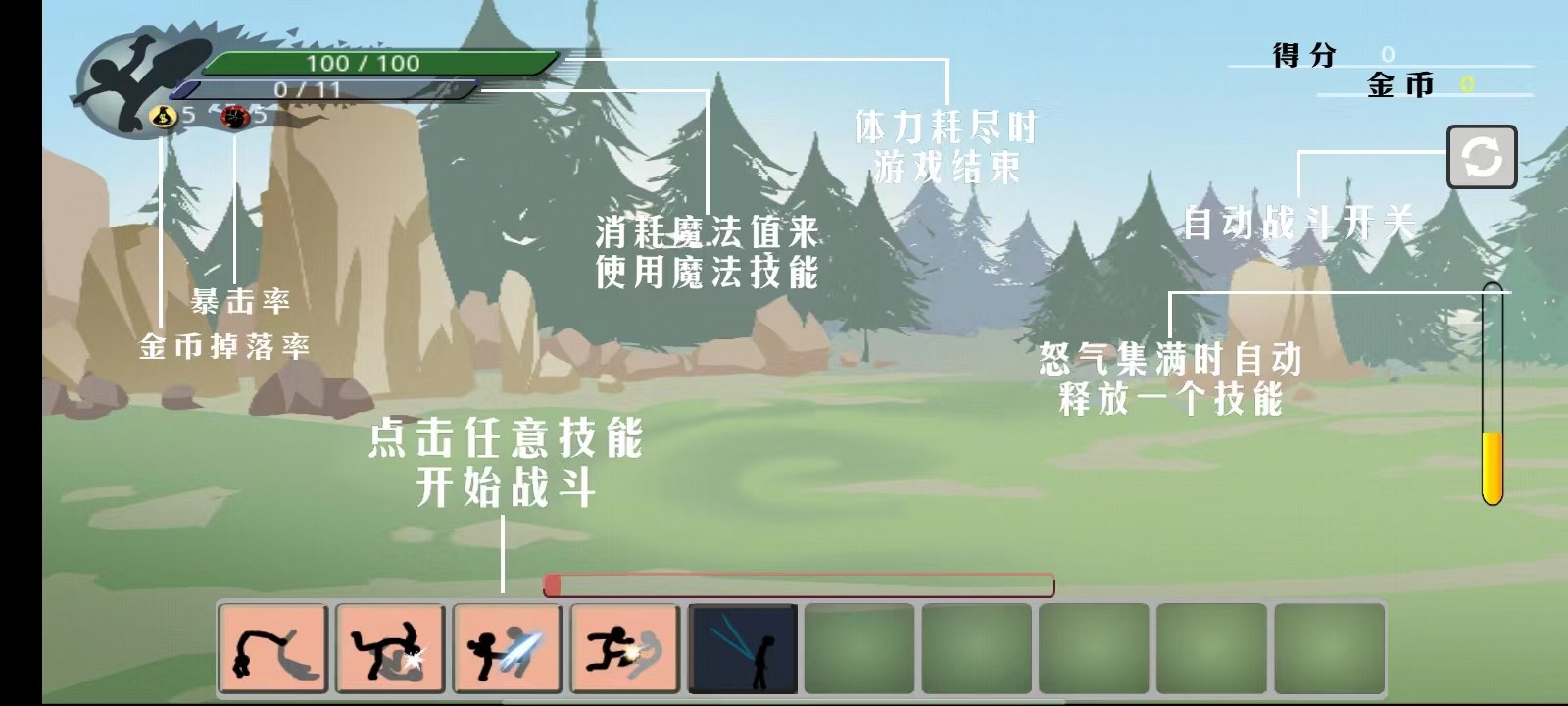 3、然后点击下方的任意技能就可以开始战斗;在开始战斗之前可以点击右上方的自动战斗开关(也可以不开,这个可以依据自身喜好来设置),当上方绿色的血条耗尽的时候,游戏结束;