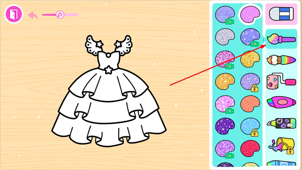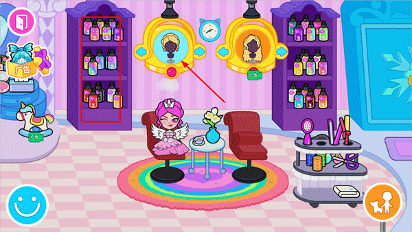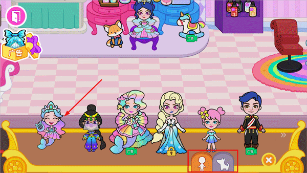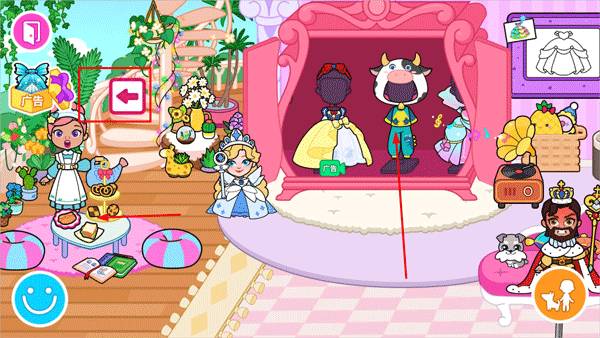 2、左右滑动可以切换房间内的场景,可以挪动公主的位置,点击衣柜里的衣服给公主换装,左上角箭头可以切换到其他场景;
