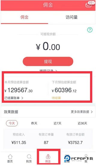 5、进入底部「佣金」栏目,实时查看收入明细、推广数据及订单状态。