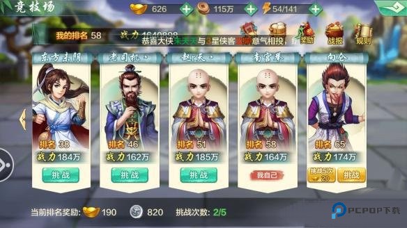 参考案例:这里看看我朋友 “南宫举”(V0)的阵容实例吧。他就用了 4-1-3 阵型,标准平民配置。他当前战力 164 万,竞技场排名已经打到第 58 位!(当然了,他运气有点好,直接抽到 4 张蓝婷的整卡)。哈,我这阵子基本天天和他切磋,但基本都被压制住。这个例子说明,即便是 4-1-3,只要侠客组合和培养方向对了,平民也能玩出不错的高度。