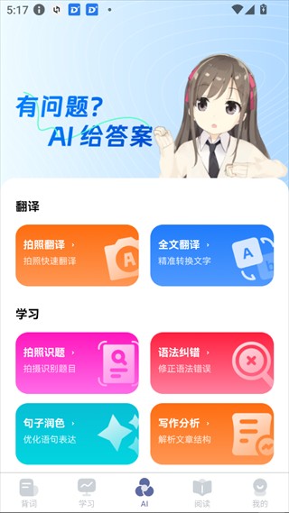 AI解答疑问,内置翻译、学习、练习等功能(如拍照翻译、拍照识图、语法纠错)
