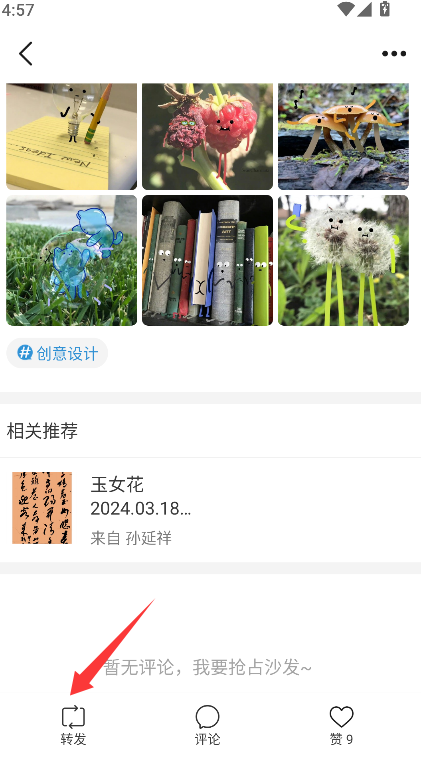 3、在浏览朋友圈内容时,遇到欣赏的作品,可点击作品下方的转发功能按钮。