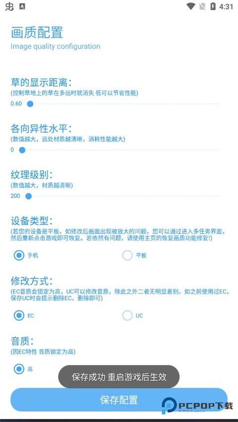 4、配置保存后会弹出成功提示,最后重启游戏就能享受全新画质啦。