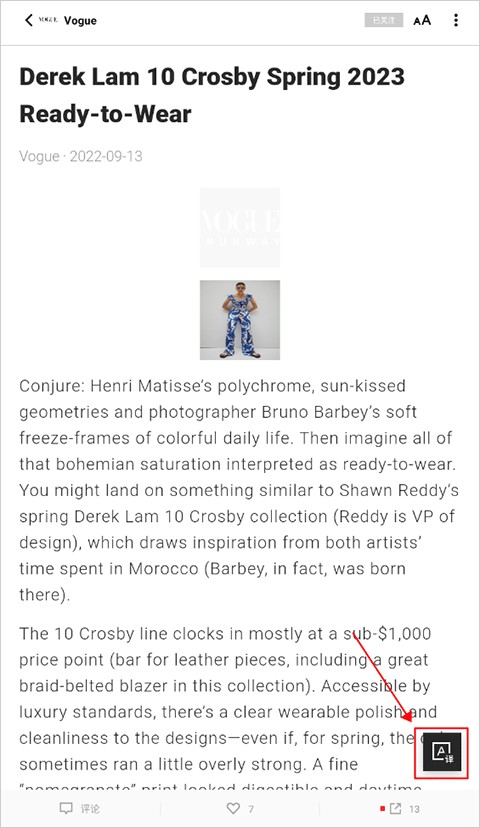2、点击即可翻译页面的内容,再次点击“A译”可撤销翻译。