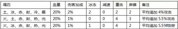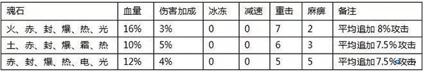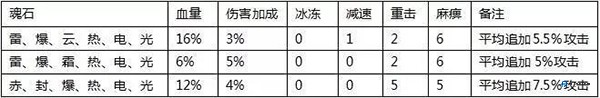魂石基础效果:单颗魂石自带水、火、雷、风、土、冰六种元素伤害属性以及伤害穿透效果。经过玩家们的实际测试,打野怪时有个规律:你所有元素伤害值加在一起,再乘以 0.305,这个结果大约就是你能额外打出的伤害。简单理解,拥有 1000 点某种元素伤害,对怪物大约能提升 305 点伤害。至于伤害穿透,它在玩家对战时(PK)比较关键,很可能是用来抵消对方萤石提供的元素抵抗,这样变相让你的元素伤害变得更高。