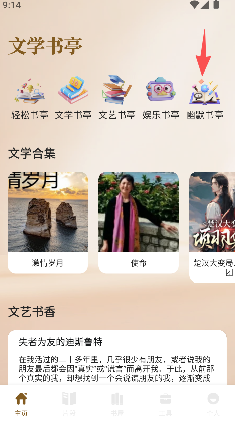1、提供书亭类别选择功能,进入文学书亭板块点击幽默书亭等类别,即可查看该类别下的书籍列表,获取对应风格的读物。