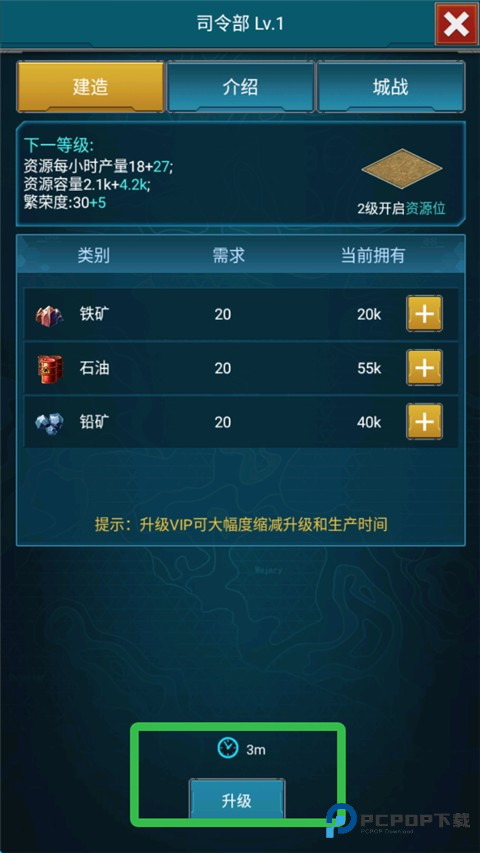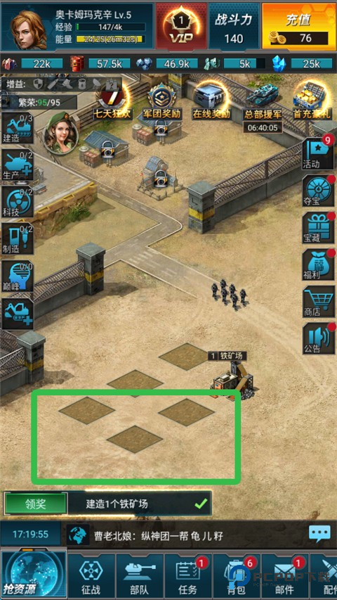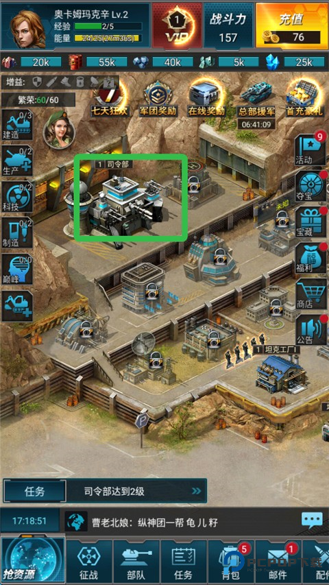 1、紧跟任务线推进基地建设,完成任务获取资源与道具奖励;