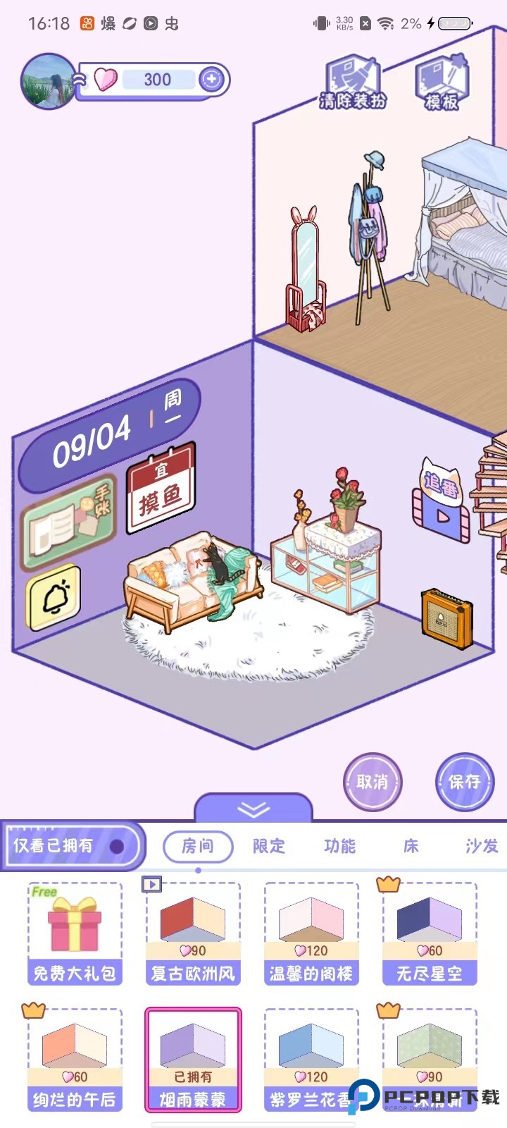 3、进入装扮页面以后,在分类列表可以左右滑动,点击就可以查看对应的分类,分类下面会有很多的装扮道具,可以在房间中进行搭配,搭配好理想装扮以后,点击【保存】即可;