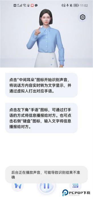 点击中间的耳朵还可以识别声音,大家只要直接讲出自己所要翻译的句子即可,然后上方就会自动通过虚拟人打出相对应的手语;