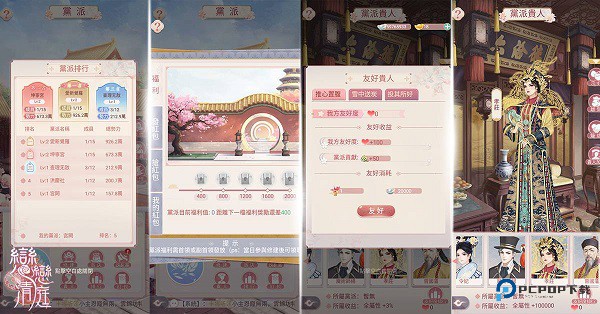 党派系统增加各位小主之间的互动,党派囊括了各类事件的记载、成员列表、党派管理、党派修建、党派商店、党派boss诛乱党、党派贵人、党派排行和党派红包。