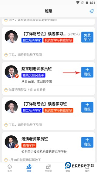 2、然后,你可以选择你感兴趣的课程及老师,点击右侧的“+班级”,即可进入加入。