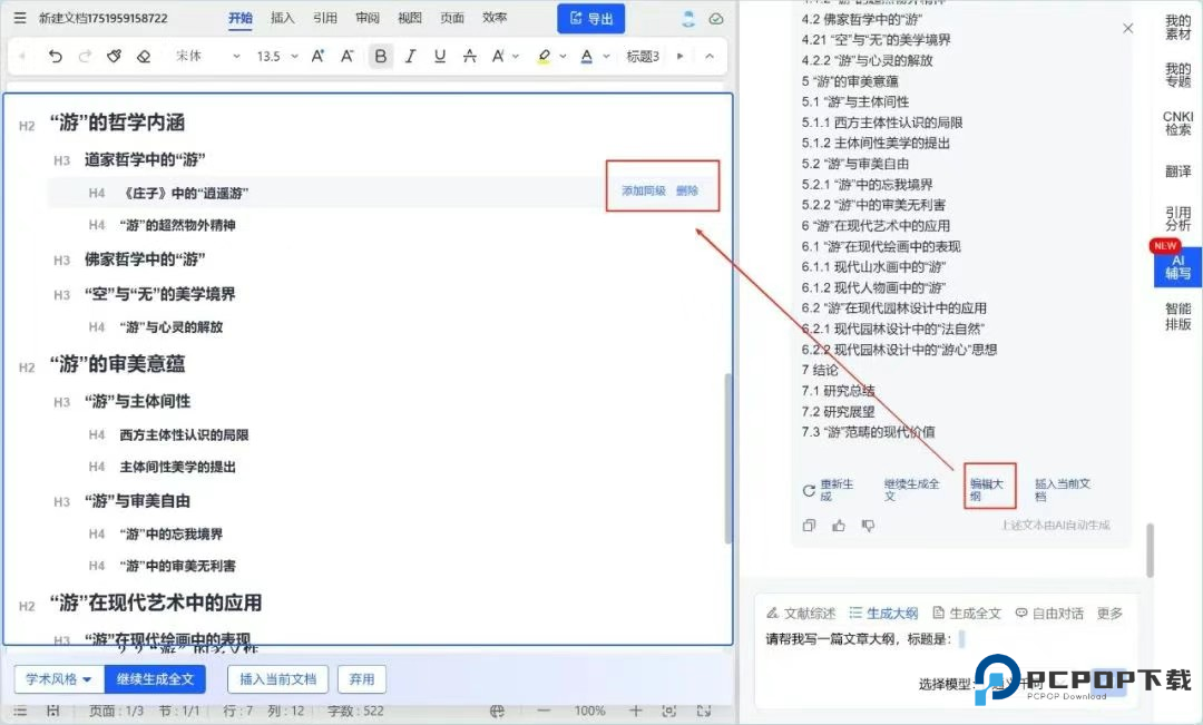 点击【编辑大纲】,进入大纲编辑模式,根据自己的写作想法,对论文大纲进行编辑各级标题、添加同级和子级、删除章节等的修改,使论文逻辑更加顺畅,符合自身需要。