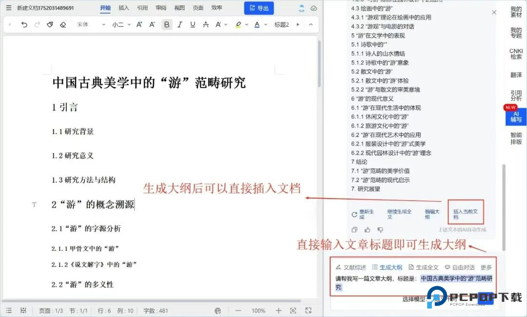 生成后点击【插入当前文档】,大纲即可插入内置文档,省去手动排版的麻烦。