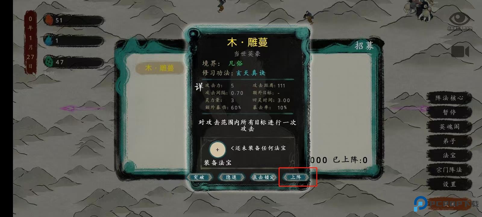 7、招募完成以后,点击【弟子】,再点击【上阵】;可以把刚刚招募的英雄全部上阵;