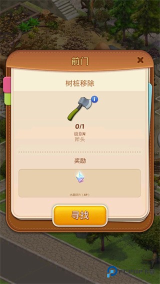 2、很快你会注意到树桩之类障碍物,清除它们需要斧头。这时界面上会弹出提示,指引你点击 “寻找” 选项去获取斧头。