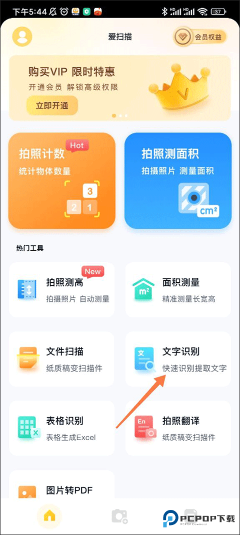 1、打开 APP 进入主页,从「拍照测高」「文件扫描」「文字识别」等功能区选中「文字识别」图标;