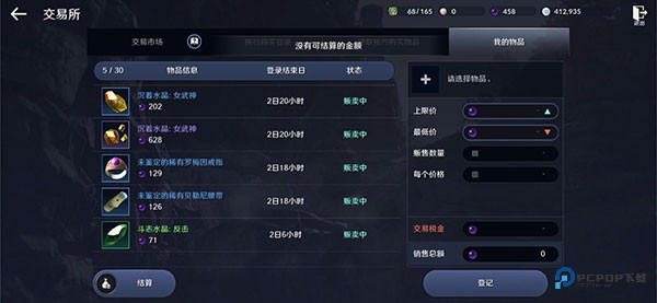 点开交易所界面,找到 [我的物品] 或类似的标签页(通常是卖东西的入口)。