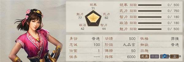 武力型老婆,71统+82武,能步能骑并且有1级行军。