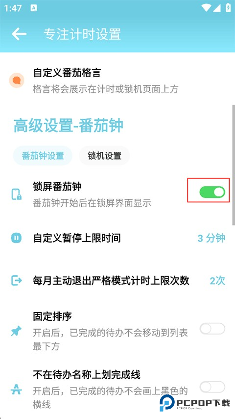 2、在专注计时设置中下滑找到锁屏番茄钟,打开右侧的开关即可。