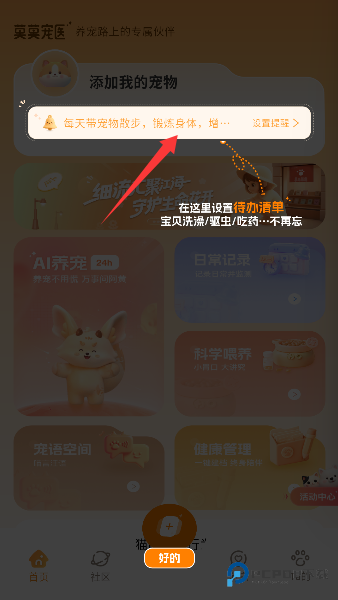 3、戳进设置提醒,洗澡驱虫吃药全安排明白,手机秒变唠叨小秘书,再也不用担心忘事被主子白眼伺候。