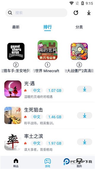 1、打开app进入到软件界面,在精品中可以看到各种好玩的游戏推荐。