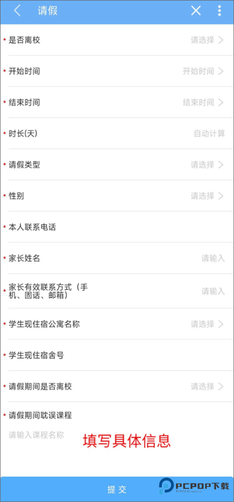 4、进入请假申请界面后,按照要求把请假的具体信息都填完,确认无误后点 “提交” 按钮搞定。