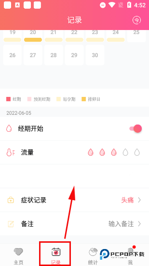 3、想记录今天的感觉?轻轻点一下 “记录” 进去就好。在那里呀,你能选择描述流量大小、写写有什么不舒服的症状,再加点小备注,方便地把当天的身体小变化统统存下来。