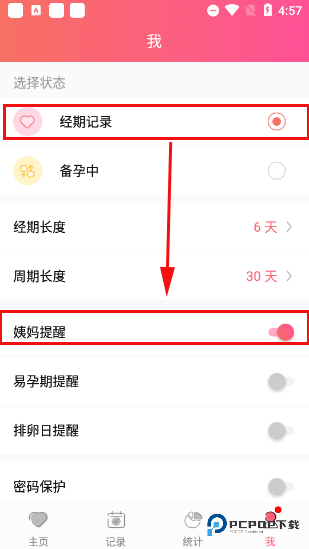5、滑动到 “我” 的页面,可以选择两种小状态:“经期记录” 或者 “备孕中”。选 “经期记录” 模式呢,它只帮你打开月经来的提醒;要是选 “备孕中” 模式,哎哟,那提醒可全了,包括月经、易孕期和排卵期都会及时通知你,蛮实用吧。