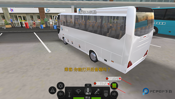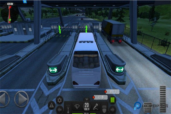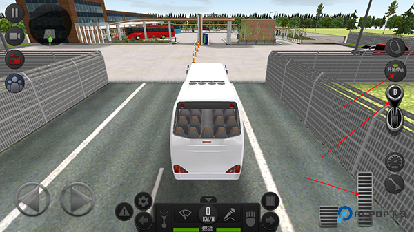 4、进入游戏当中后,我们需要驾驶公交车,通过点击如图所示的开始停止、换挡杠、加速按钮来启动公交车!