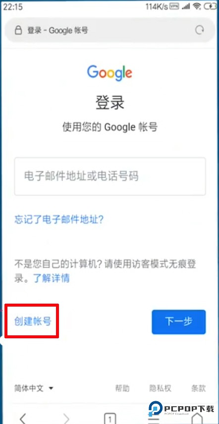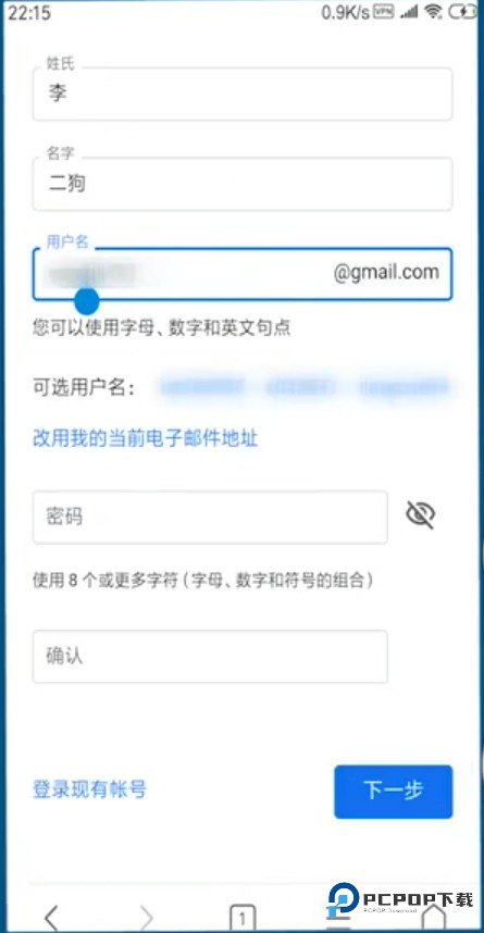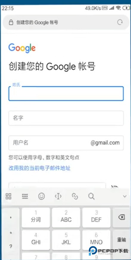进入创建账号页面,按照页面提示依次输入姓氏、名字和自己设置一个邮箱地址名字