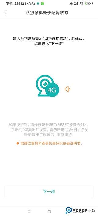6、静静等待一会儿。当听到摄像机发出语音提示 “网络连接成功”(或者 App 界面出现连接成功提示)时,在 App 上点击「下一步」。