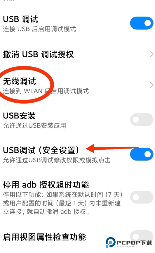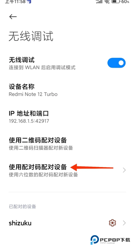 3、打开USB调试,进入无线调试并打开,点击使用配对码配对