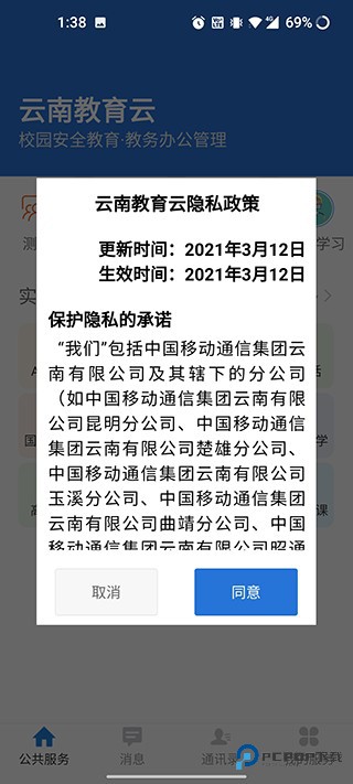 1、点击云南教育云app图标,首先会显示教育云的相关隐私政策、手机权限使用许可;