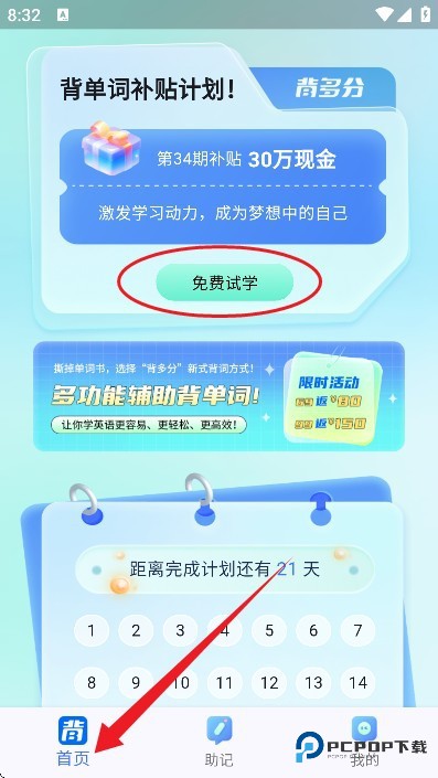 1、启动软件,点击首页【免费试学】按钮,即可开启单词学习之旅;