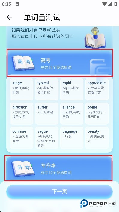 4、软件支持选择学习等级,如高考、专升本等,选定后点击【提交】,即可开展针对性检测;