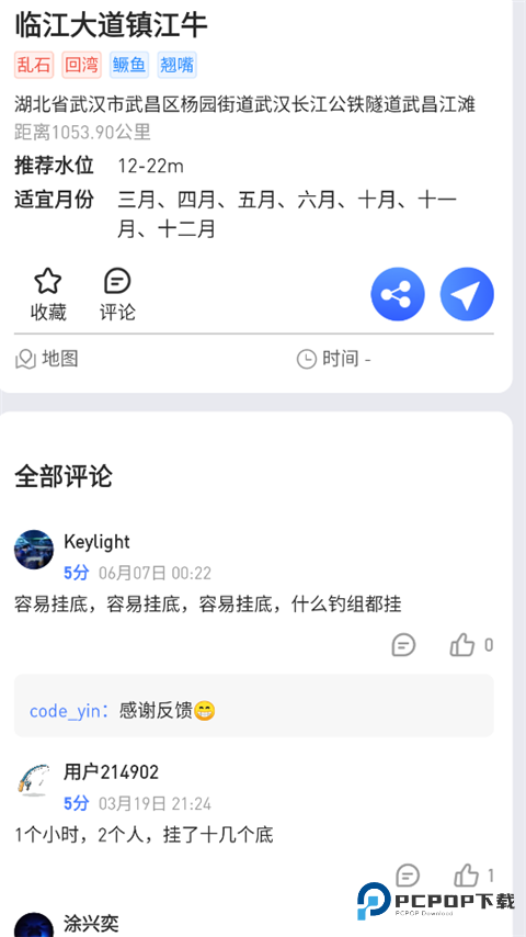 3、选择钓点进入,查看详细位置、推荐水位以及其他钓友的评价。