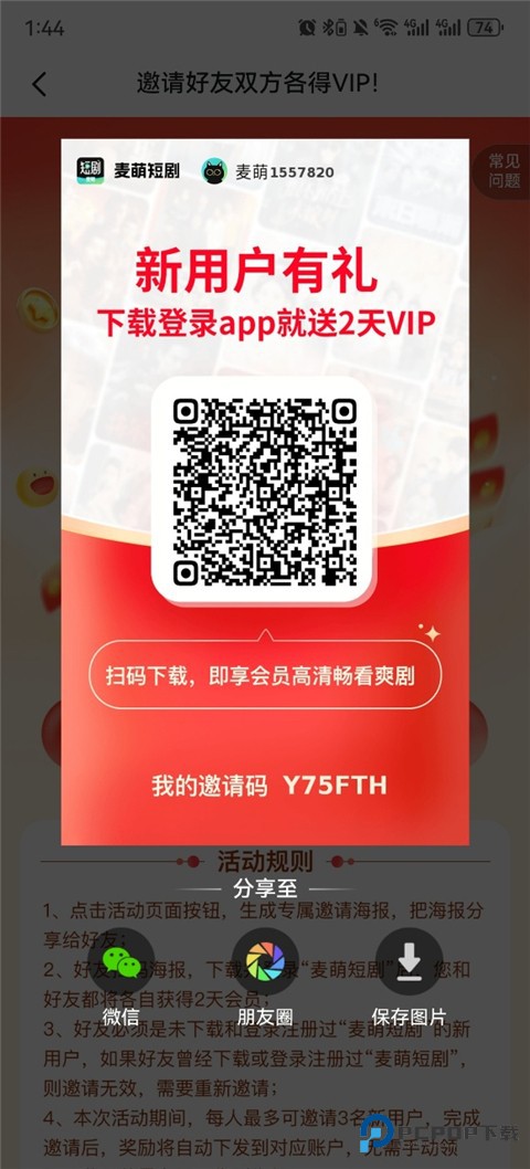 2、在这里点击邀请好友生成一个二维码海报,分享给对方进行扫码下载即可。