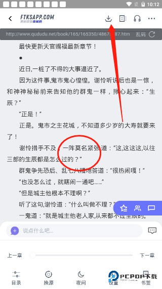 4、现在我们就来到了小说的阅读的界面,先点击手机屏幕中心,然后我们在点击右上角的“下载”图标。