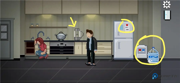 打开冰箱下层获得一个柠檬;点击水桶装饮水机,根据冰箱上贴的纸条提示的红蓝点击水龙头,打开后即可用玻璃杯装水。把柠檬和水分别装入榨汁机,拾取柠檬汁喂给妻子。