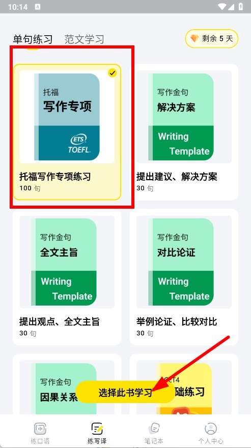1、打开英语嘎嘎说,在练习页选托福写作专项练习,点击选择此书学习。