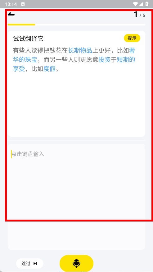 3、在练习界面,根据提示试试翻译它,对给定句子进行翻译练习。